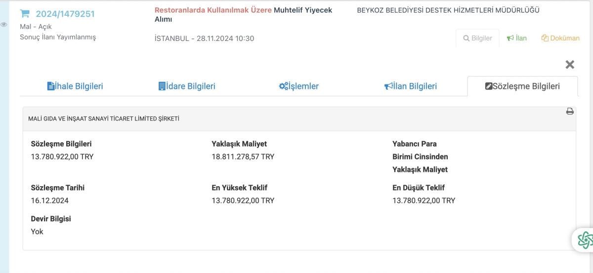 Buna göre Beykoz Belediyesi Destek Hizmetler Müdürlüğü, 28 Kasım 2024'te "Restoranlarda Kullanılmak Üzere Muhtelif Yiyecek Alımı" ihalesine çıktı.