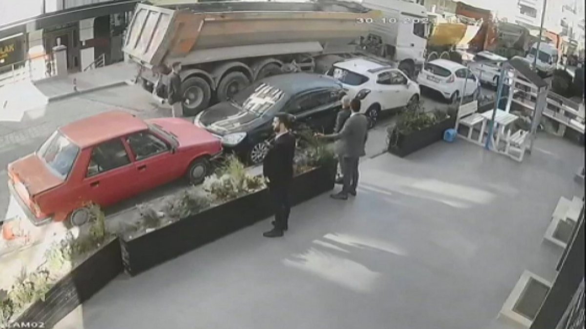 İstanbul'un Beylikdüzü ilçesine bağlı Kavaklı Mahallesi'ne hafriyat almaya gelen kamyonlardan biri, sürücüsünün el frenini çekmeyi unutmasıyla aniden hareket etti.