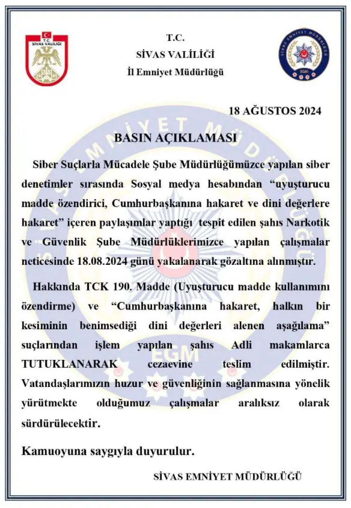 Sivas İl Emniyet Müdürlüğü, olayla ilgili bir açıklama yaparak Gürkan'ın tutuklandığını bildirdi.