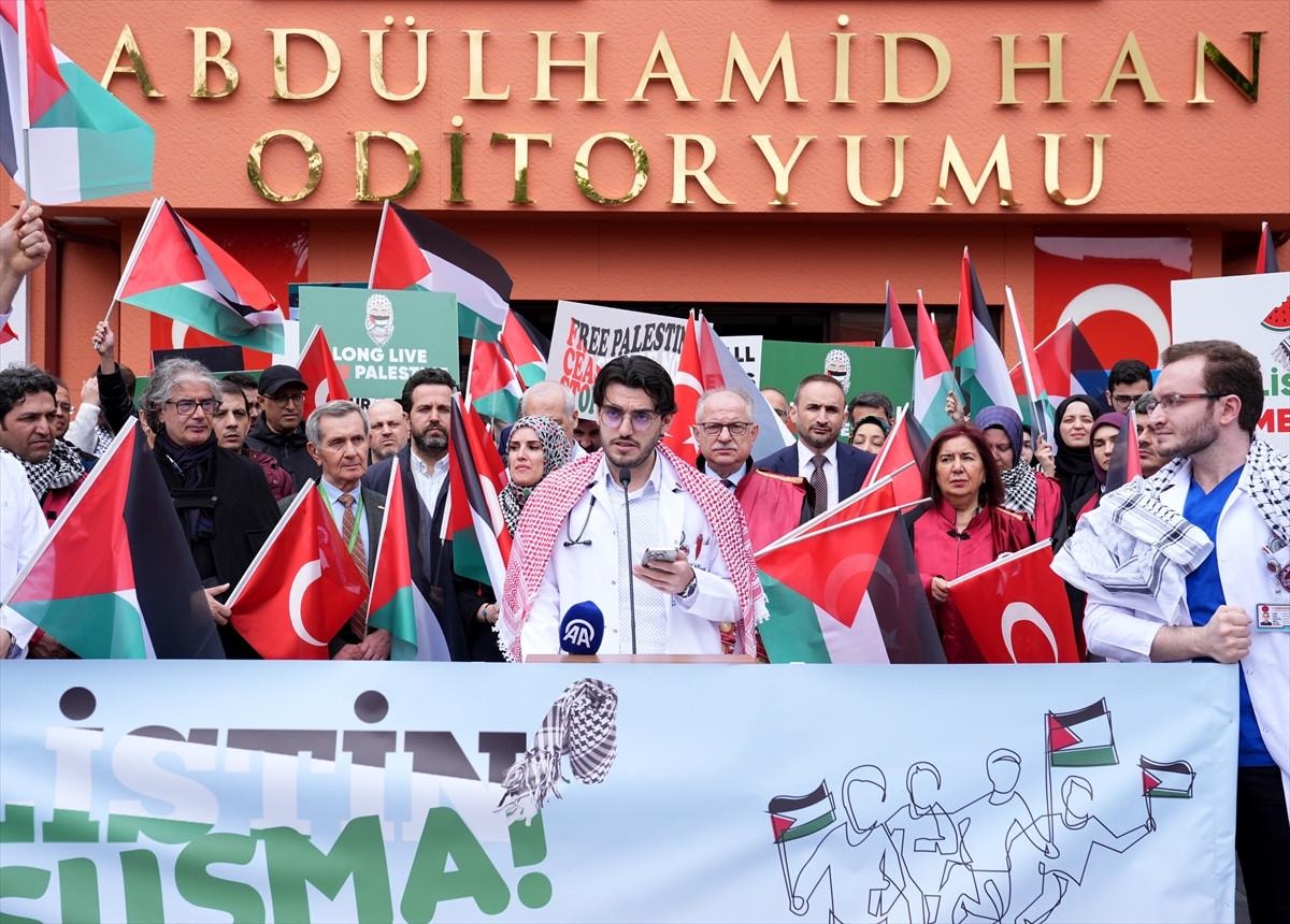Üniversitenin Fatih'te bulunan kampüsündeki oditoryum önünde bir araya gelen katılımcılar, "Nehirden denize özgür Filistin", "Zalimler için yaşasın cehennem" sloganları attı.