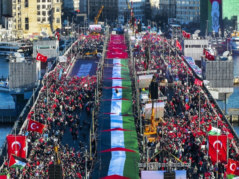 Ellerinde Türk ve Filistin bayrakları olan ve Gazze'ye destek için kefiye takan katılımcılar tramvay yolunu takip ederek Yeni Camii ve Galata Köprüsüne ulaştı.