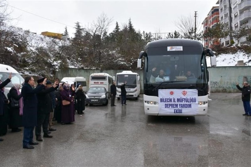 Deprem felaketinde zarar gören vatandaşlara yardım etmek üzere Bilecik İl Müftüsü Ali Erhun’un başkanlığında gönüllü personellerden oluşturulan 55 kişilik ekip yola çıktı.