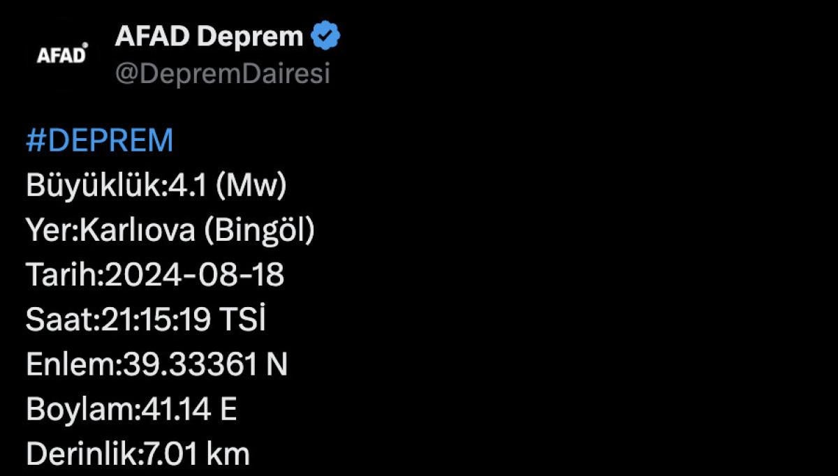 Afet ve Acil Durum Yönetimi Başkanlığı'nın açıklamasına göre Bingöl'ün Karlıova ilçesinde saat 21.15'te 4.1 büyüklüğünde bir sarsıntı yaşandı.
