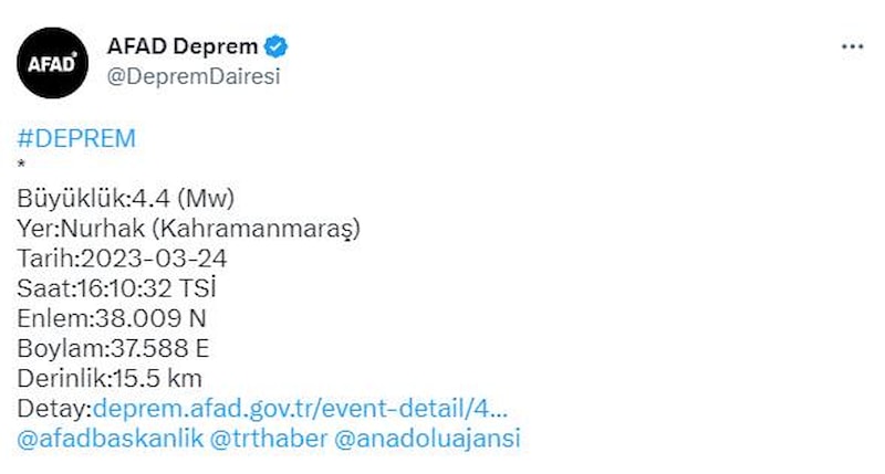 AFAD'dan edinilen bilgiye göre, Kahramanmaraş'ta saat 16.10'da yerin 15.5 kilometre derinliğinde 4.4 büyüklüğünde bir deprem yaşandı.