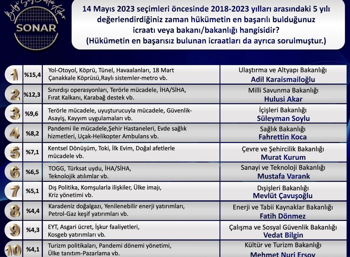 Farklı sosyo-ekonomik ve demografik katılımcıların görüşlerinin alındığı ankette,"14 Mayıs 2023 seçimleri öncesinde 2018-2023 yılları arasındaki 5 yılı değerlendirdiğiniz zaman hükümetin en başarılı bulduğunuz icraatı veya bakanı, bakanlığı hangisidir?" diye soruldu.