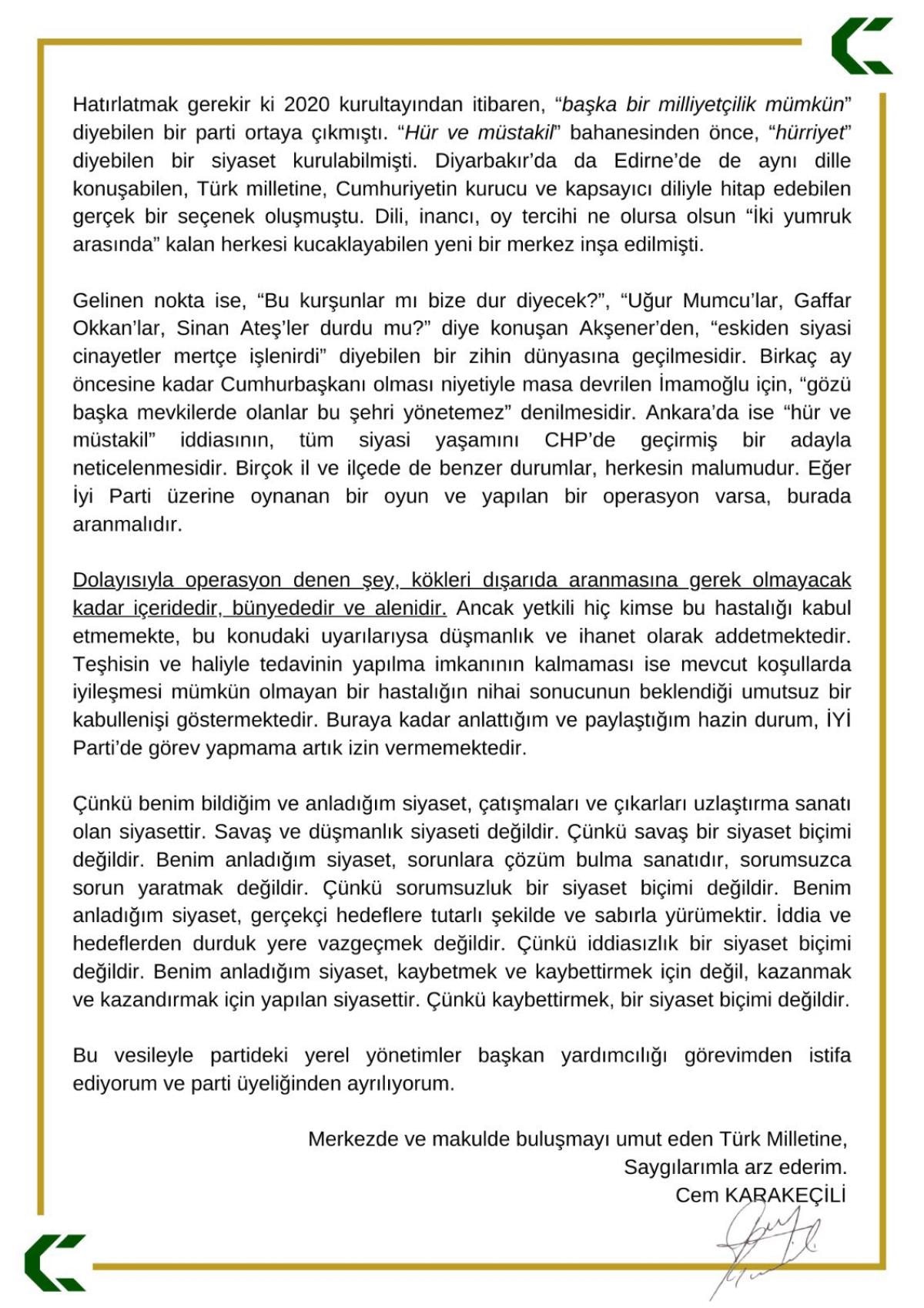 Sosyal medya hesabından yaptığı paylaşımla kararını açıklayan Karakeçili, sözlerinde parti lideri Meral Akşener'e de sitem etti.