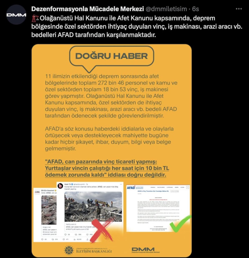 BirGün ve Halk TV'nin başı çektiği bazı yayın organlarında 6 Şubat'taki Kahramanmaraş merkezli depremlerin etkilediği illerde 'AFAD'ın kontrolündeki vinçler için ailelerden para alındığına göz yumulduğu' iddiaları yer almıştı.