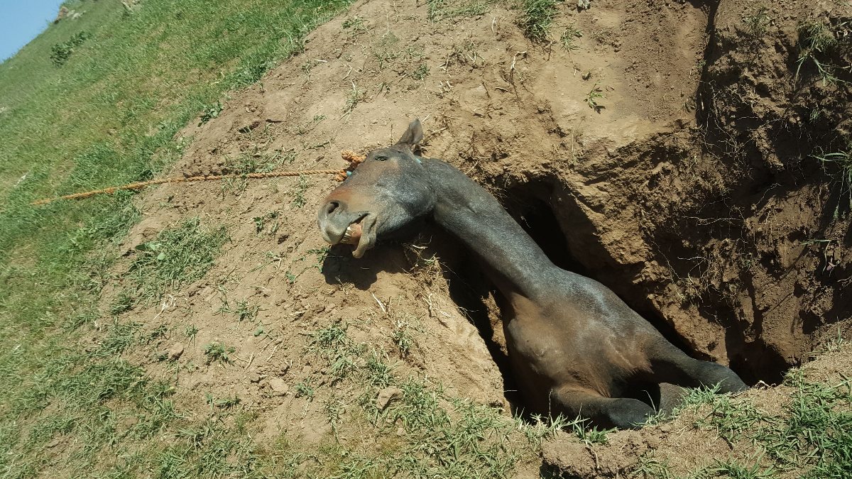 Eski köy mezarlığı mevkiinde sahibi tarafından otlaması için alana bağlanan at, dengesini kaybederek defineciler tarafından yapılan kazılarla tahrip edilen alandaki lahit mezar çukurlarından birine düştü.