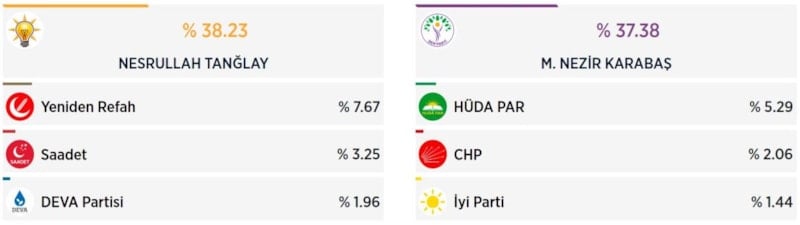 AK Parti'nin adayı Nesrullah Tanğlay 8 bin 900, DEM Parti adayı Mehmet Nezir Karabaş 8 bin 702 oy aldı.