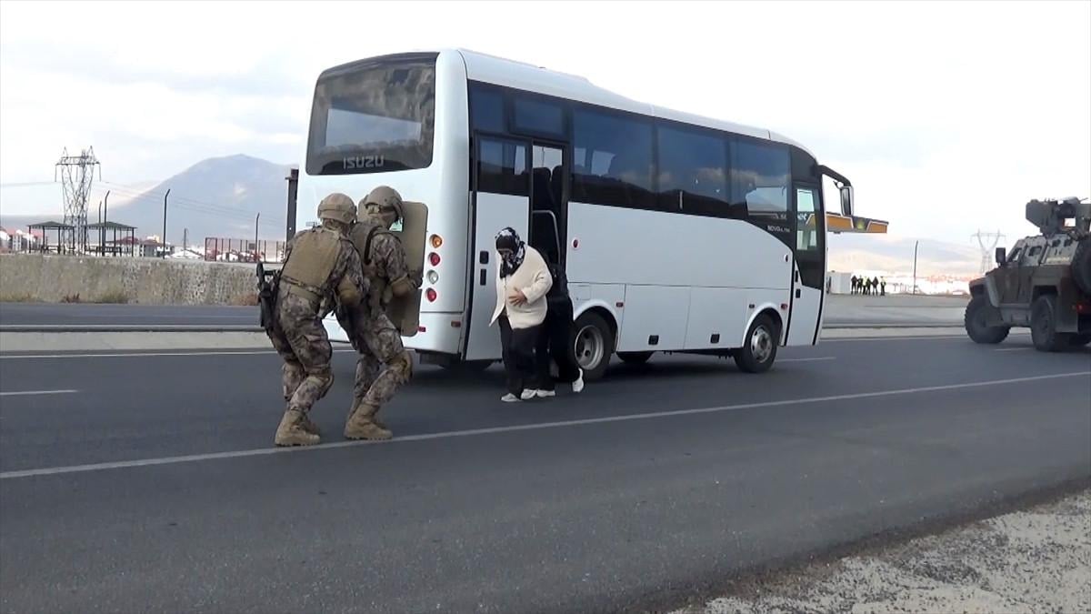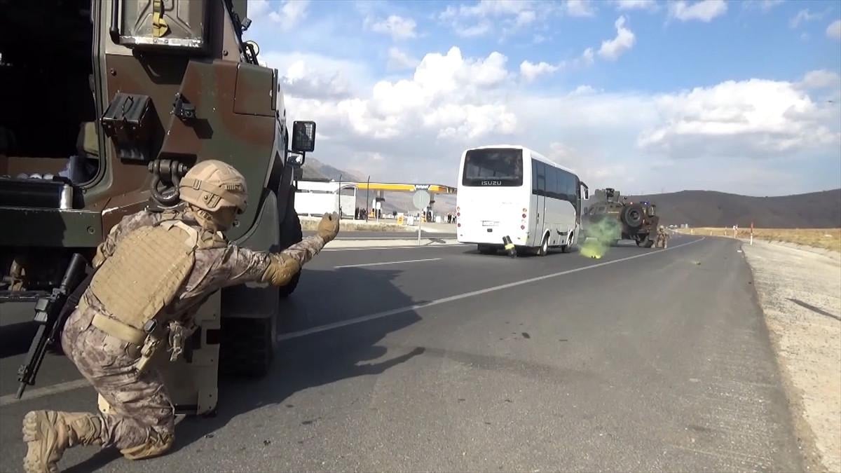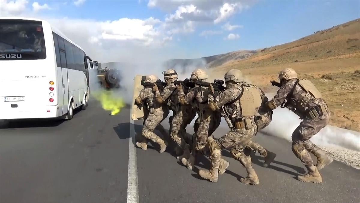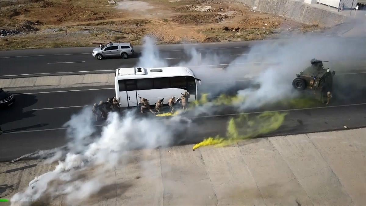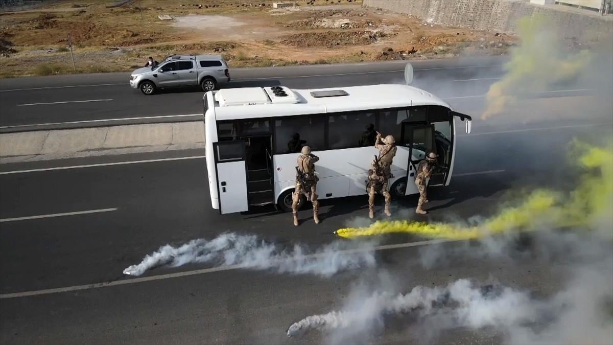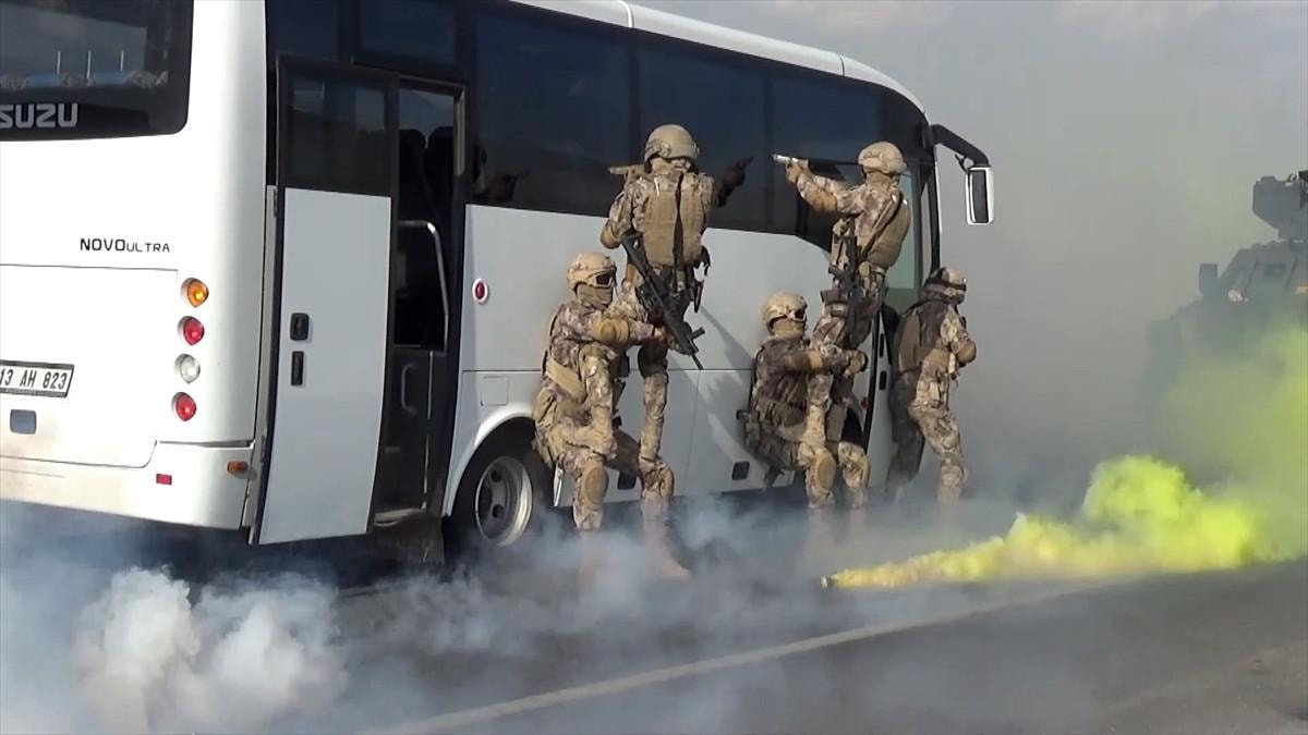 Tatbikatta, senaryo gereği, kimliği belirsiz silahlı kişilerce kaçırılan otobüste rehin alınanların kurtarılması için çalışma başlatıldı.