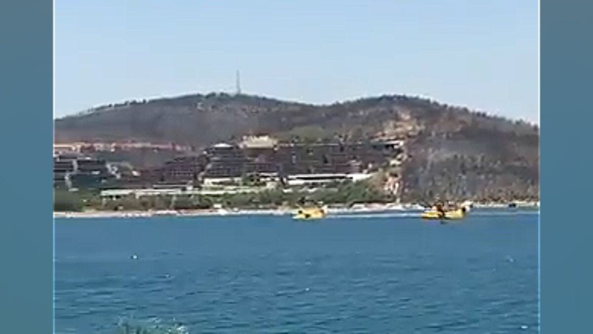 Bir otelin önünden su almak için alçalan yangın söndürme uçağı, deniz üzerindeki jet-ski nedeniyle durmak zorunda kaldı.