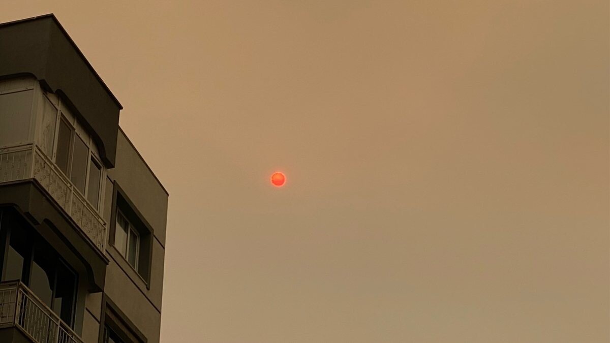 Muğla ve Aydın'da da devam eden yangınlar, İzmir'de gökyüzünü sarı renge bürüdü. Güneş, gökyüzünde turuncu bir nokta şeklinde belirdi.