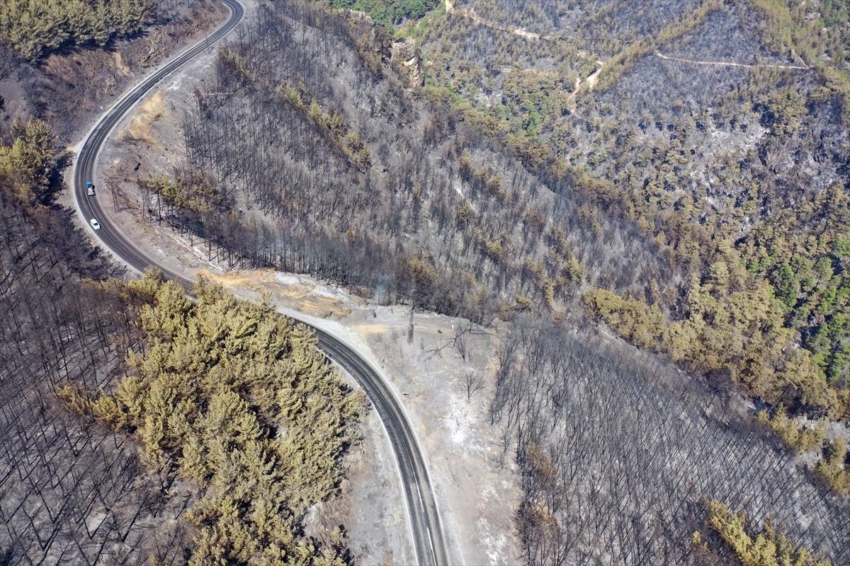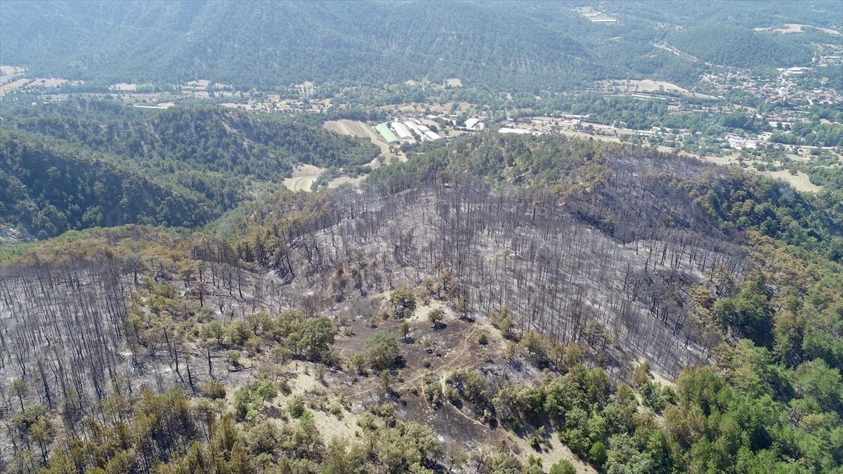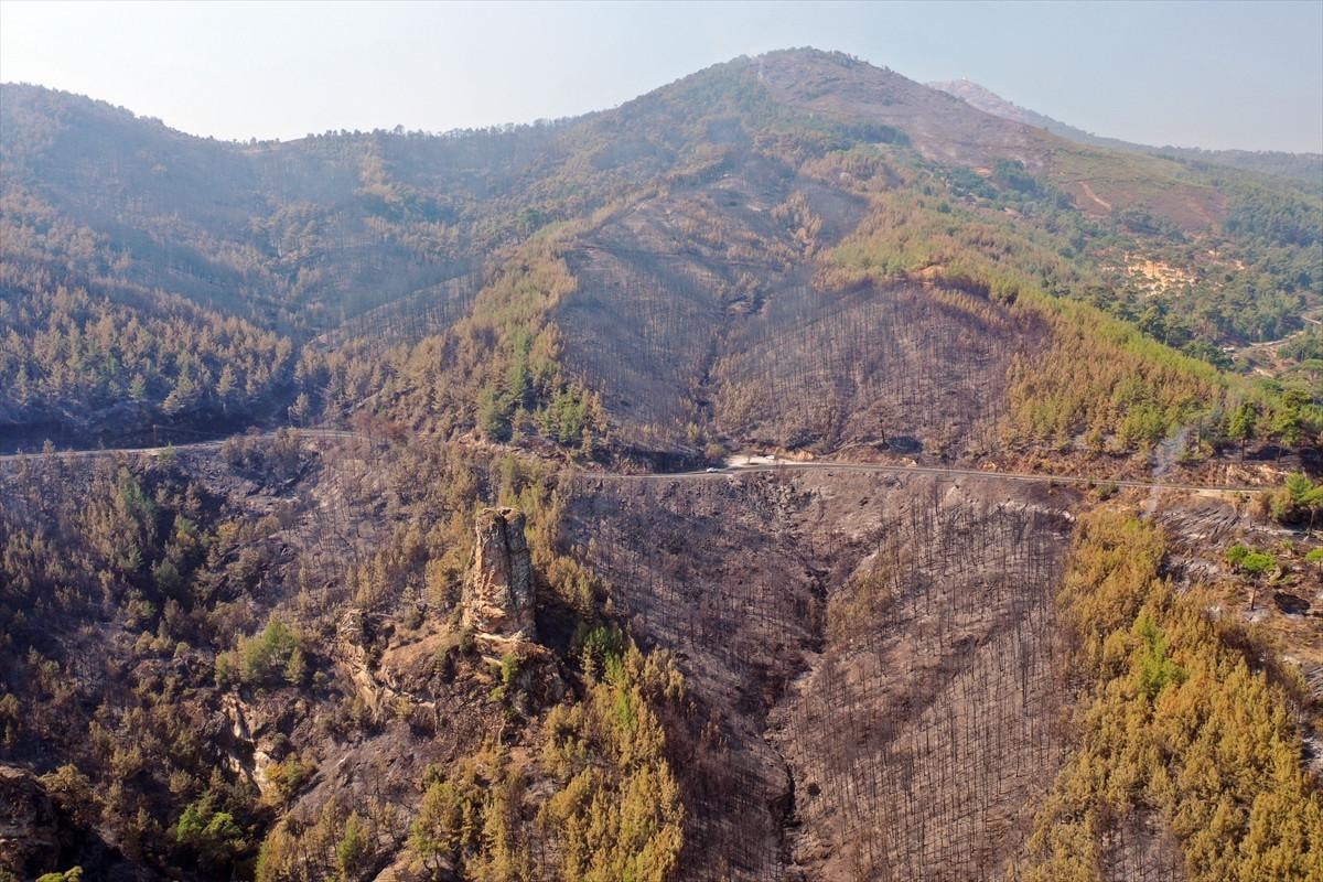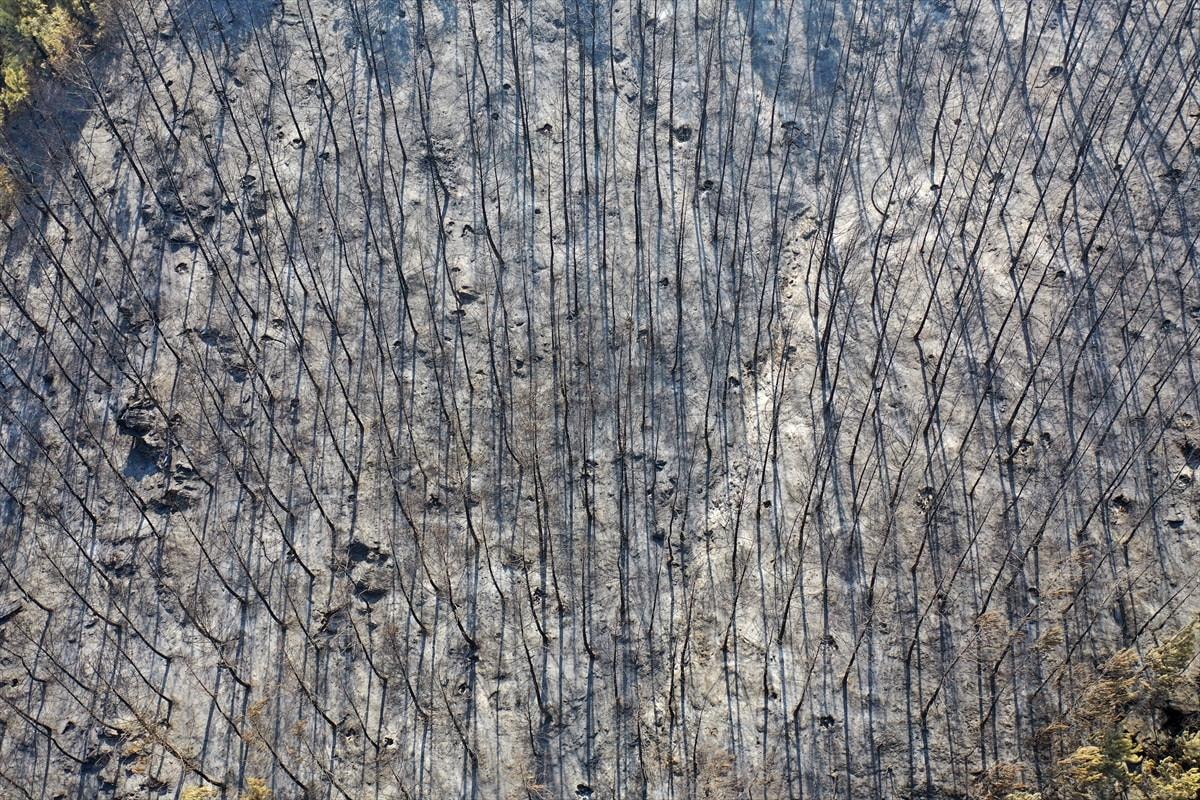 Yangında zarar gören ormanlık alan, Dedeler Köyü mevkisinde havadan görüntülendi.