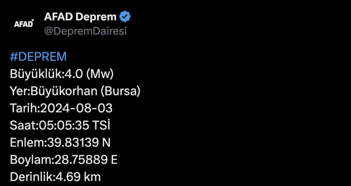 Bursa'nın Büyükorhan ilçesinde saat 05.05'te 4 büyüklüğünde deprem oldu.