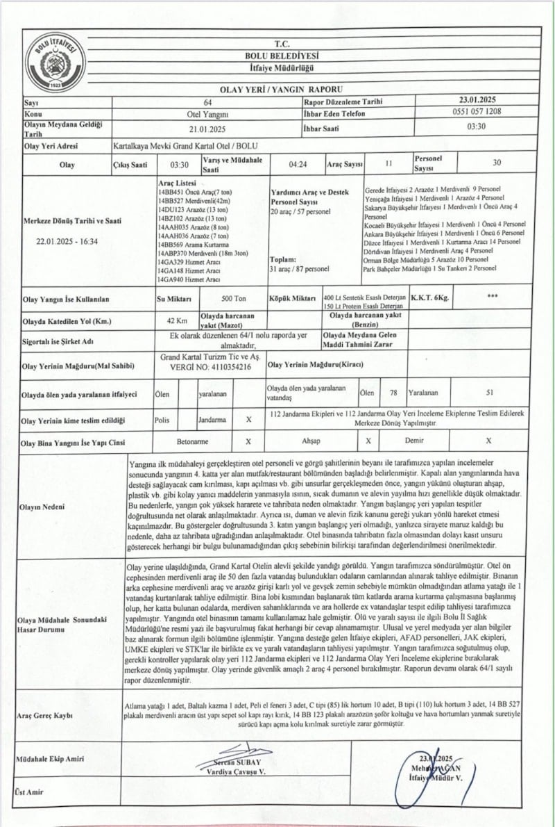 78 kişinin yaşamını yitirdiği faciaya ilişkin Bolu Belediyesi İtfaiye Müdürlüğünce hazırlanan olay yeri yangın raporu ortaya çıktı.