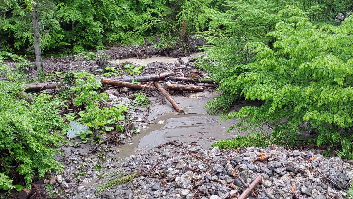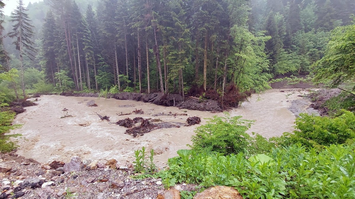 Dere kenarındaki çam ağaçları da devrilerek taşan suya karıştı.
