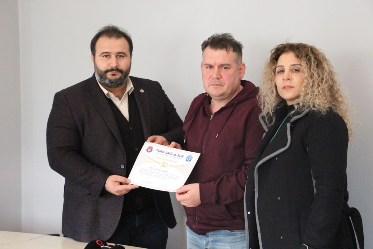 Bayram Ceran'a örnek davranışı dolayısıyla Türk Sağlık Sen Bolu Şube Başkanı Furkan Özübek tarafından teşekkür belgesi verdi.