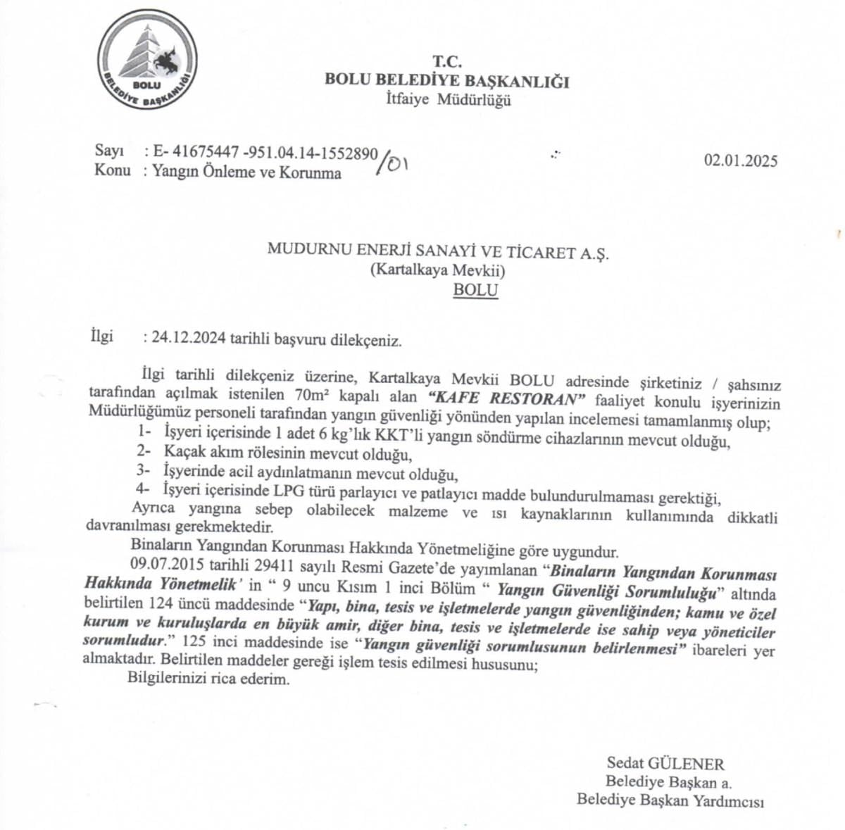 Bolu Belediye Başkanı Tanju Özcan'ın "yetki alanımızda değil" dediği otelin kafe-restoran bölümüne, 2 Ocak 2025 tarihinde Bolu Belediyesi İtfaiye Müdürlüğü tarafından yangın güvenliği raporu düzenlendiği ifade edildi.