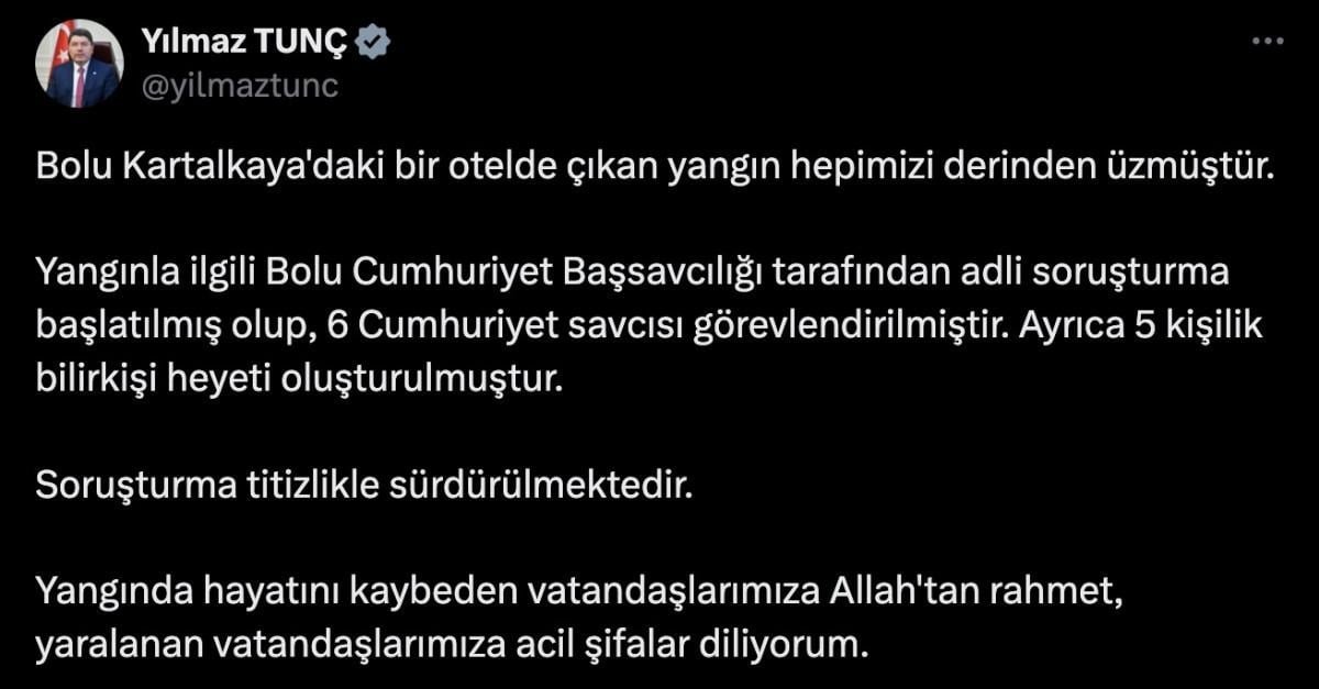 Adalet Bakanı Yılmaz Tunç, sosyal medya hesabı üzerinden Bolu Kartalkaya'daki bir otelde çıkan yangına ilişkin paylaşımda bulundu.