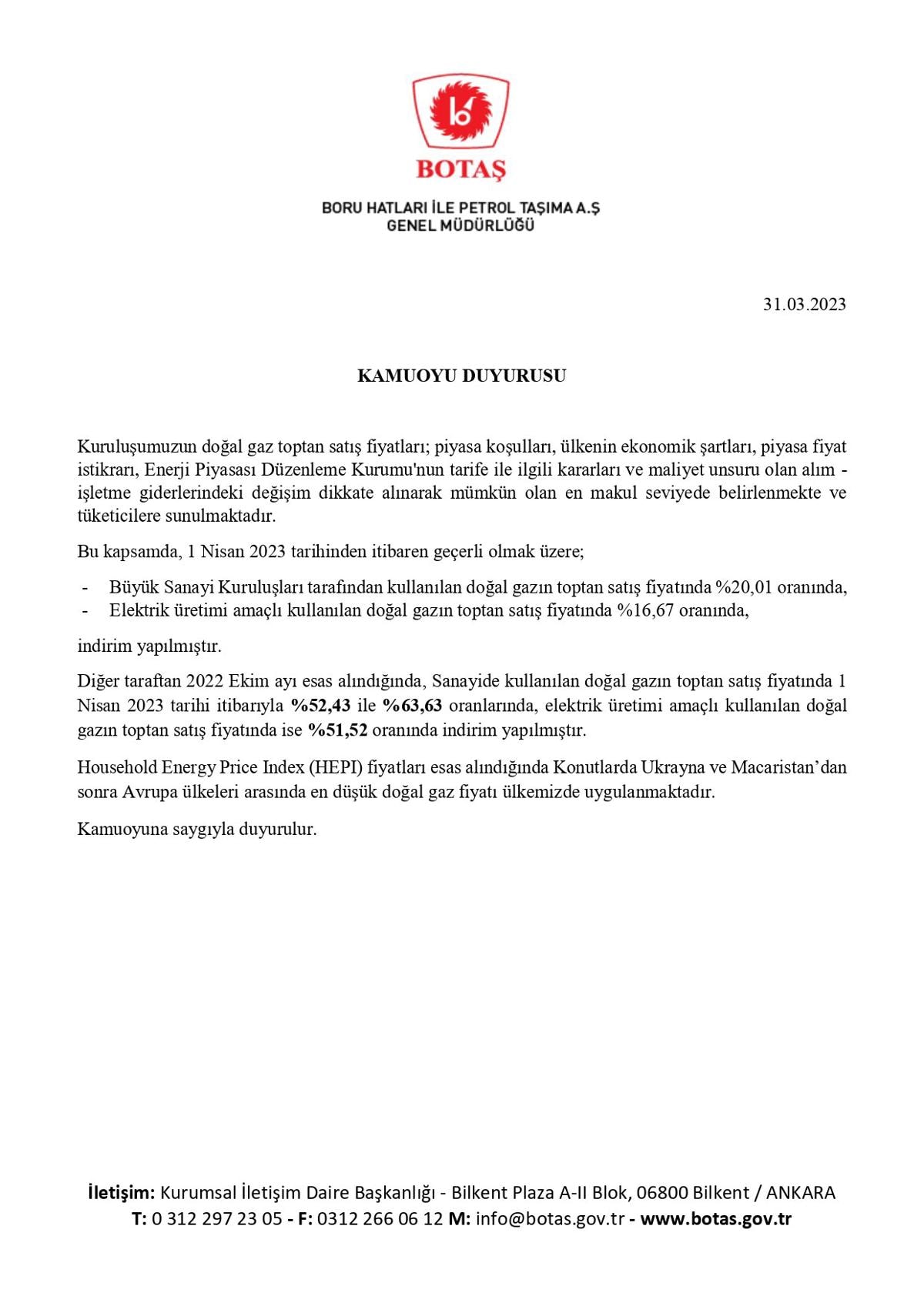 Bu kapsamda 1 Nisan 2023 tarihinden itibaren geçerli olmak üzere; Büyük sanayi kuruluşları tarafından kullanılan doğalgazın toptan satış fiyatında yüzde 20,01 oranında, elektrik üretim amaçlı kullanılan doğalgazın toptan satış fiyatında yüzde 16,67 oranında indirim yapılmıştır.