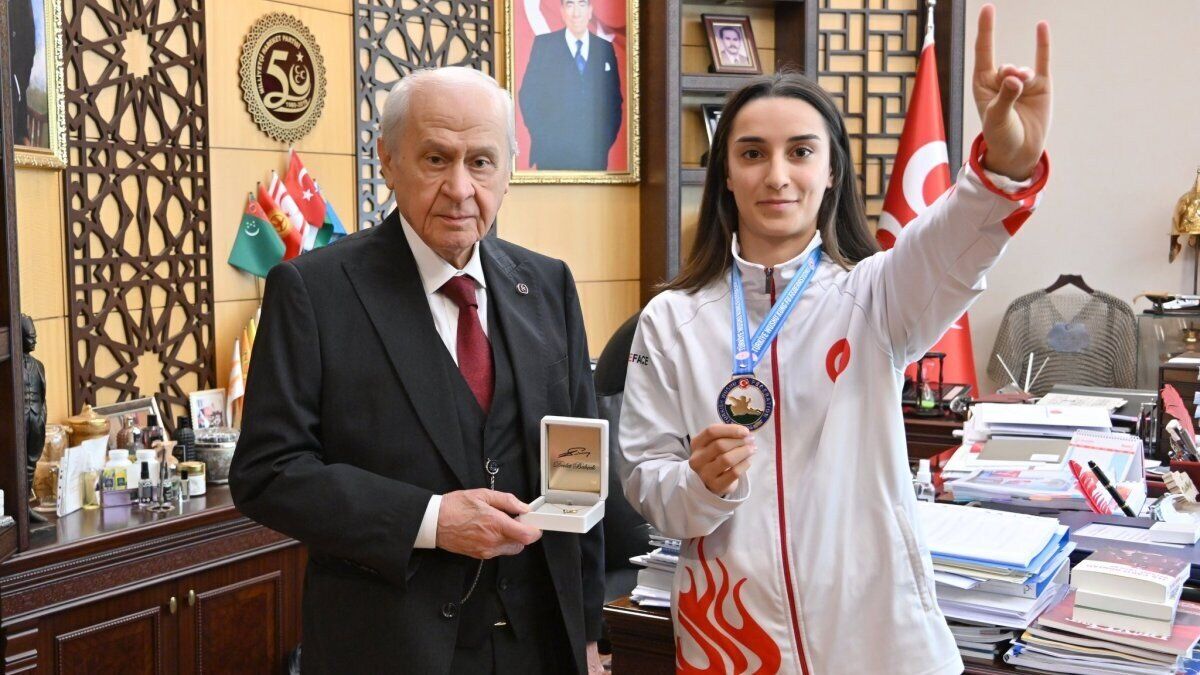 Bahçeli ile yan yana gelen sporcu, yine bozkurt işareti yaparak adeta meydan okudu.