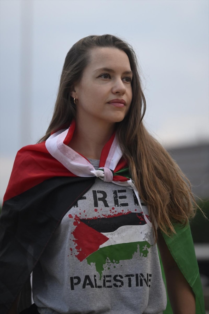 Filistin bayrakları taşıyan protestocular, "Özgür Filistin" ve "Yaşasın Filistin" sloganları atarak İsrail'in saldırılarının durmasını istedi.
