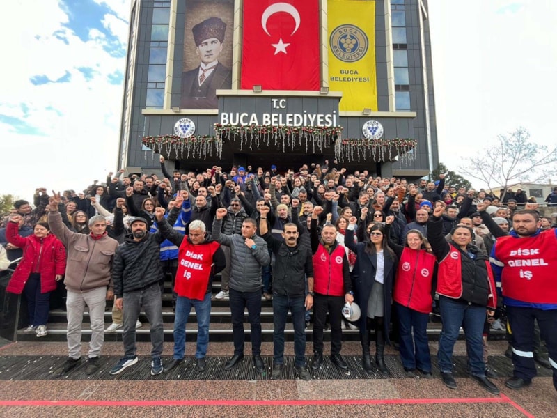 Disk Genel-İş İzmir 6 No'lu Şube Yönetim Kurulu üyeleri ve çalışanlar, Buca Belediyesi önünde toplanarak greve başladı.