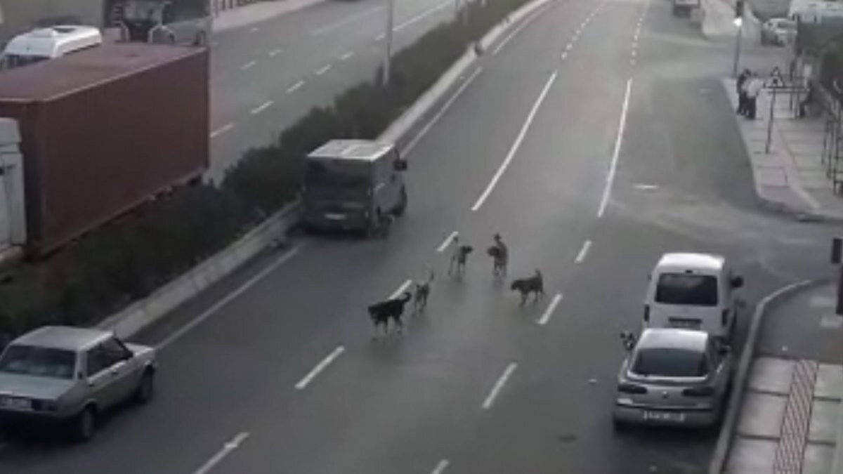 Toplu halde caddeyi istila eden köpekler, önlerine çıkan her araca saldırıyor. Sürücüleri zor durumda bırakan köpekler, yoldan geçen yayalara da korku salıyor.