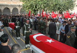 Er Mehmet Coşkun'un cenazesini karşılamak için, Ulu Cami girişinde tören mangası hazırlandı. Şehit Mehmet Coşkun'un büyük annesi İslim Coşkun ve yakınları, şehit cenazesinin camiye getirilesini beklerken Kürtçe ağıtlar yaktı. Şehit Er Mehmet Coşkun'un cenazesi, tören mangası eşliğinde Ulu Cami'ye getirilerek katafalka konuldu. Bu sırada Coşkun'un annesi ve yakınları tabuta sarılıp ağıtlar yaktı, bazı aile fertleri, şehit Mehmet Coşkun'u son bir kez görebilmek için tabutu açmak istedi. Ulu Cami'de öğle namazının ardından kılınan cenaze namazından sonra şehit Mehmet Coşkun'un cenazesi alkışlar eşliğinde camiden çıkarıldı. Cenaze, dev bir Türk Bayrağı ile şehit ve gazi dernekleri ile vatandaşların oluşturduğu kortej eşliğinde bir süre eller üzerinde taşındı. Şehit er Mehmet Coşkun'un yakınlarından bazıları tören sırasında baygınlık geçirdi, bazı aile fertlerinin ise yürüyüş sırasında güçlükle ayakta durabildikleri görüldü. Şehit Er Mehmet Coşkun'un cenazesi, kortej yürüyüşünün ardından cenaze arabasına konularak Yeşilkent Mezarlığı'na götürüldü. Kortejin kent merkezinden geçişi sırasında, kaldırımlardaki vatandaşların bulundukları yerde bekleyerek saygı duruşunda bulundukları gözlendi. Şehit Çavuş Altuntaş, annesinin yanına defnedildi Şırnak'ın Gabar Dağı'nda PKK'lı teröristlerin pususunda şehit olan 13 askerden Piyade Çavuş 23 yaşındaki Seyfi Altuntaş, bugün Samsun'un Ayvacık İlçesi'nde 3 bin kişinin katıldığı törenin ardından gözyaşları arasında toprağa verildi. Şehidin cenazesi, 7 yıl önce doğum sırasında kaybettiği annesi Fadime Altuntaş'ın yanına defnedildi. Dün askeri uçakla Samsun Çarşamba Havaalanı'na getirilen ve buradan da Askeri Hastane'nin morguna kaldırılan Piyade Çavuş Seyfi Altuntaş'ın Türk bayrağına sarılı tabutu, bu sabah Ayvacık İlçesi'ndeki Yunus Emre Mahallesi'ndeki evinin önüne getirildi. Ardından şehit Seyfi Altuntaş'un tabutu törenin yapılacağı Müftülük önüne kortej eşliğinde getirildi. Türk bayraklarıyla donatılan ilçede, teröre lanet yağdırıldı. Yaklaşık 3 bin kişinin katıldığı törende, ellerinde Türk bayrakları ile 'Şehitler ölmez vatan bölünmez', 'Kahrolsun PKK' sloganları atıldı. Törenin ardından şehidin Türk bayrağına sarılı tabutunun önüne gelen ailesi gözyaşlarını tutamayarak ağıtlar yaktı. "Seyfim bizi bırakıp nereye gidiyorsun?'' diyerek tabuta sarılan yakınları sinir krizi geçirdi. Kız kardeşi Selime Altuntaş ise kendisine verilen sakinleştirici ilacın etkisiyle hiç tepki vermeden kardeşinin bayrağa sarılı tabutuna baktı. Törenin ardından Ayvacık İlçesi Yeşil Cami'nde öğle namazından sonra kılınan cenaze namazının ardından şehit Piyade Çavuş Seyfi Altuntaş'ın tabutu askerler tarafından omuzlara alınarak cenaze aracına konuldu, daha sonra da Yunus Emre Mahallesi'ne götürüldü. Piyade Çavuş Seyfi Altuntaş'ın naaşı, 7 yıl önce doğum sırasında bebeğiyle birlikte hayatını kaybeden annesi Fadime Altuntaş'ın yanına defnedildi. Cenaze törenine Genel Kurmay Başkanı ve kuvvet komutanları da çelenk gönderdi. Babaannesinin yanına gömüldüÖnceki gün Gabar Dağı'nda teröristlerin saldırısı sonucu 12 arkadaşı ile birlikte şehit düşen Piyade Komando Er Mehmet Yıldırım, memleketi Konya'nın Kadınhanı İlçesi'ne bağlı Örnek Köyü'nde gözyaşları arasında toprağa verildi. Şehit er Yıldırım, kendisinden birkaç saat önce yaşamını yitiren babaannesi Emine Yıldırım'ın mezarının yanına defnedildi. Şehit cenazesi nedeniyle 850 nüfuslu Örnek Köyü'ne 5 bin kişi toplandı. Yakınları sabah erken saatlerde şehit Mehmet Yıldırım'ın evinde toplandı. Köydeki iki camide 21 yaşında şehit olan Yıldırım için sala verildi. Törene Konya Vali Vekili Nevzat Dalkıran, Konya Garnizon Komutanı Tümgeneral Uğur Uzal, Konya Jandarma Bölge Komutanı Tuğgeneral Ata Kalkan, DSP Genel Başkanı Zeki Sezer, AKP Konya Milletvekili Ahmet Büyükakkaşlar, Kadınhanı Belediye Başkanı Mustafa Koyuncu, şehidin yakınları, askeri ve sivil erkan ile büyük bir kalabalık katıldı. Şehit Yıldırım'ın Türk bayrağına sarılı tabutu ambulansla 2 ay önce ölen dedesinin evine getirildi. Şehit erin cenaze namazı, dedesinin evinin önündeki meydanda kılındı. Bu sırada yakınları dışarı çıkarak şehidin tabutuna son kez baktı. Babası 45 yaşındaki Ali Yıldırım ile aynı yaştaki annesi Elife Yıldırım'ın cenaze töreni sırasında güçlükle ayakta durabildiği gözlendi. Yakınlarının şehit Yıldırım'ın tabutuna son kez dokunmalarına izin verildi. Elife ve Ali Yıldırım çifti, çocuklarının tabutu üzerine kapanarak gözyaşı döktü. Acılı ailenin feryatları yürekleri dağladı. Baba Ali Yıldırım, daha fazla dayanamayarak şehit oğlunun tabutu başında fenalık geçirdi. Yakınları tarafından güçlükle sakinleştirilen baba Yıldırım sağlık görevlileri tarafından ambulansa taşındı ve kendini güçlükle toparlayabildi. "ALMAYACAK MISINIZ İNTİKAMINI?'' Törene katılan Konya Garnizon Komutanı Tümgeneral Uğur Uzal önce şehidin babasını, ardından annesi ve kızkardeşini teselli etti. Tümgenaral Uzal, şehit Mehmet Yıldırım'ın annesini kalabalık içinde ararken "Bu yiğidin annesi kim?'' diye seslendi. Elini acılı annenin omzuna koyan Tümgeneral Uzal, aileyi teselli etmeye çalıştı. Anne Elife Yıldırım, Tümgeneral Uzal'a, "Almayacak mısınız bunun intikamını? Yeter artık, bitsin bu acı'' diye seslendi. Tümgeneral Uzal ise başını sallayarak yanıt verdi. Tümgeneral Uzal ayrıca şehidin kızkardeşi Serap Yıldırım'ı da elinden tutarak teselli etti. Şehit er Mehmet Yıldırım, cenaze namazının ardından köy mezarlığınd