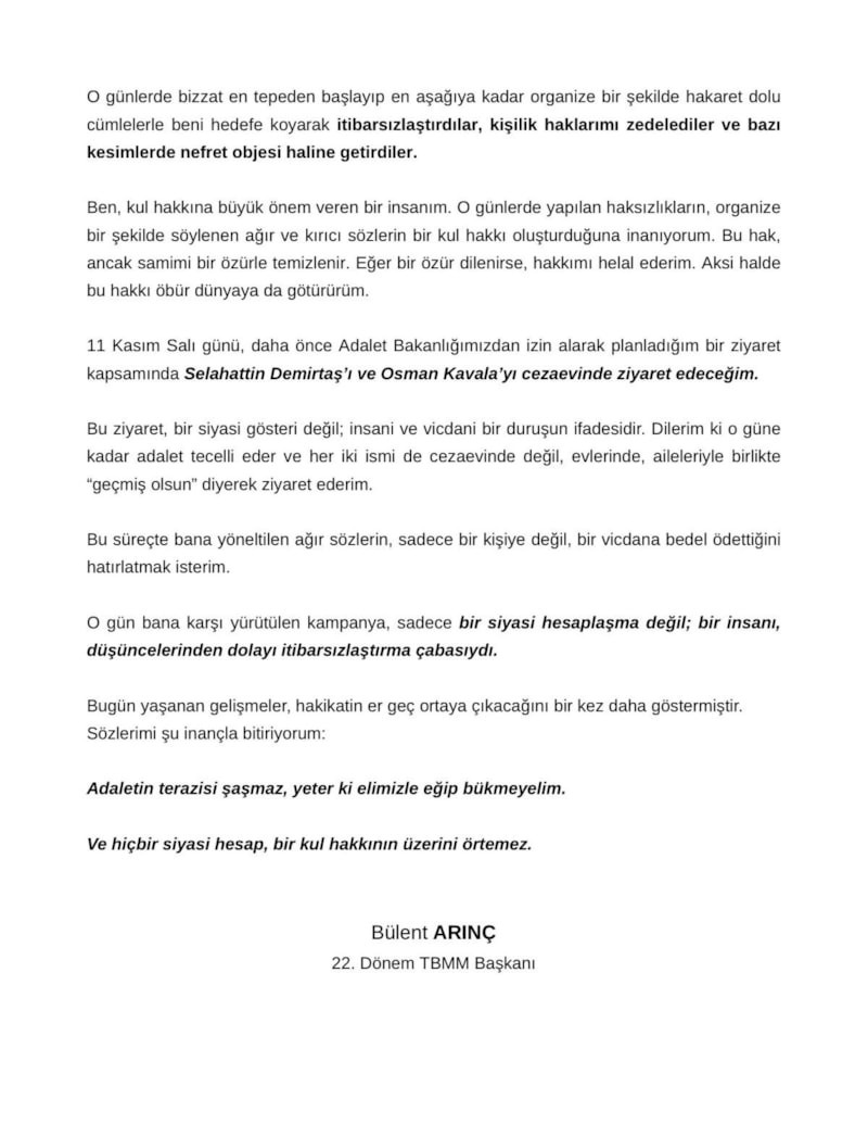 X hesabı üzerinden uzun bir yazı paylaşan Arınç, Osman Kavala ve Selahattin Demirtaş'ı da 11 Kasım'da ziyaret edeceğini söyledi ve şöyle devam etti;