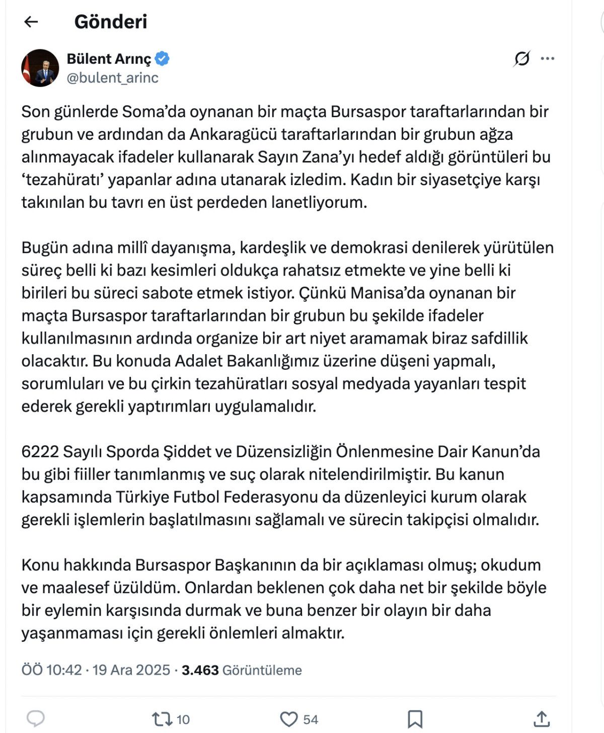 "Son günlerde Soma’da oynanan bir maçta Bursaspor taraftarlarından bir grubun ve ardından da Ankaragücü taraftarlarından bir grubun ağza alınmayacak ifadeler kullanarak Sayın Zana’yı hedef aldığı görüntüleri, bu ‘tezahüratı’ yapanlar adına utanarak izledim. Kadın bir siyasetçiye karşı takınılan bu tavrı en üst perdeden lanetliyorum.