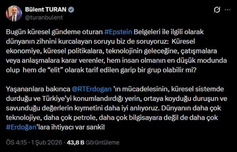 Epstein belgelerinde dünyada bilinen birçok ismin karanlık yüzüne dair yazışmaların ortaya çıkması sonrası İçişleri Bakan Yardımcısı Bülent Turan'dan "Dünyanın daha çok Erdoğan'lara ihtiyacı var" paylaşımı geldi.