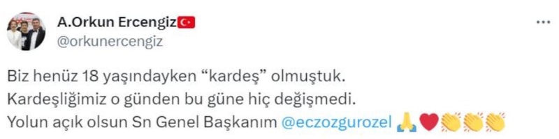 Özgür Özel'i "kardeş" olarak tanımlayan Belediye Başkanı Ercengiz, CHP'nin yeni liderine başarılar diledi.