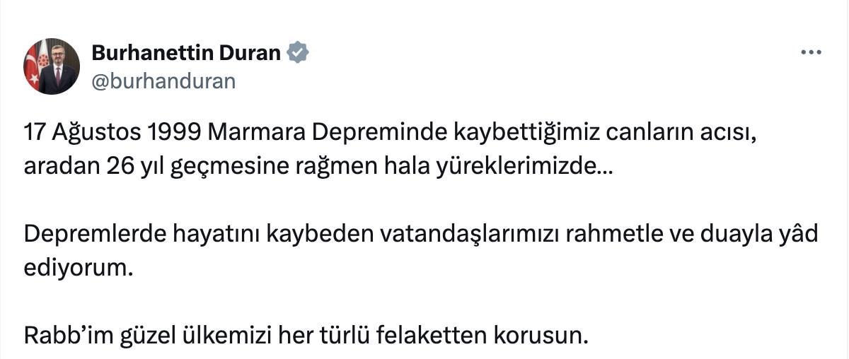 Burhanettin Duran, sosyal medya platformu X hesabından yaptığı paylaşımda şu ifadeleri kullandı: