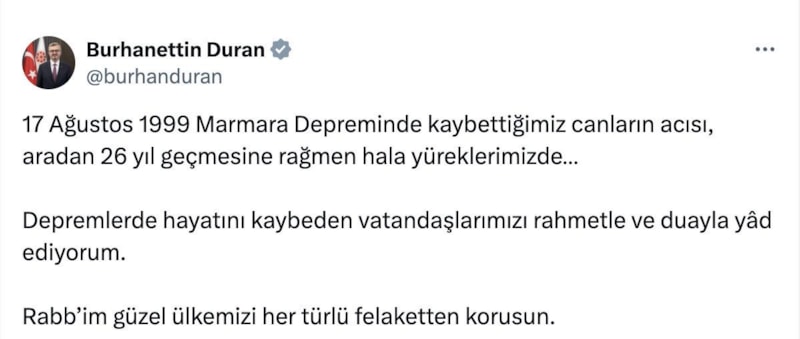 Cumhurbaşkanlığı İletişim Başkanı Burhanettin Duran, 17 Ağustos 1999 Marmara Depremine ilişkin yaptığı paylaşımda, "Depremlerde hayatını kaybeden vatandaşlarımızı rahmetle ve duayla yâd ediyorum" ifadelerine yer verdi.
