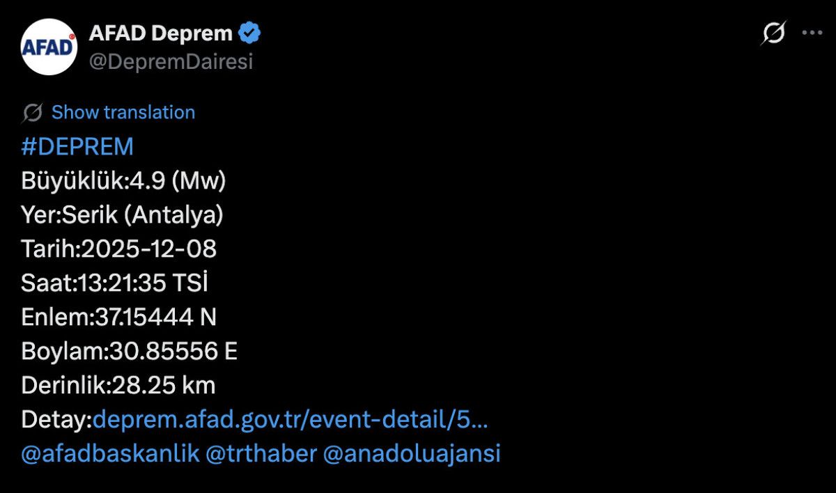 - Antalya'nın Serik ilçesinde 4.9 büyüklüğünde deprem yaşandı.