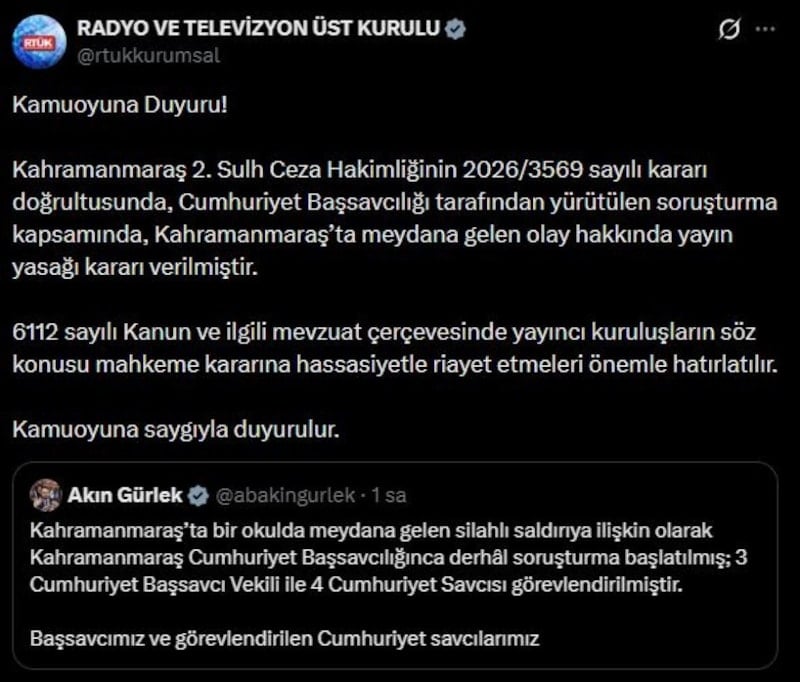 Yaşanan saldırıya ilişkin olarak Kahramanmaraş 2. Sulh Ceza Hakimliğinin 2026/3569 sayılı kararı doğrultusunda, Cumhuriyet Başsavcılığı tarafından yürütülen soruşturma kapsamında yayın yasağı getirildi.