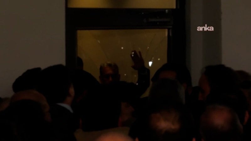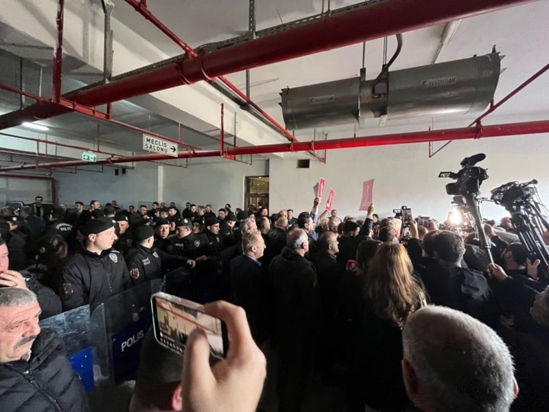 Ancak meclisi takip etmek istediğini öne süren yaklaşık 200 kişilik CHP'li grup, otoparkın içinden üst kata çıkan kapının camını kırıp, içeri girdi.