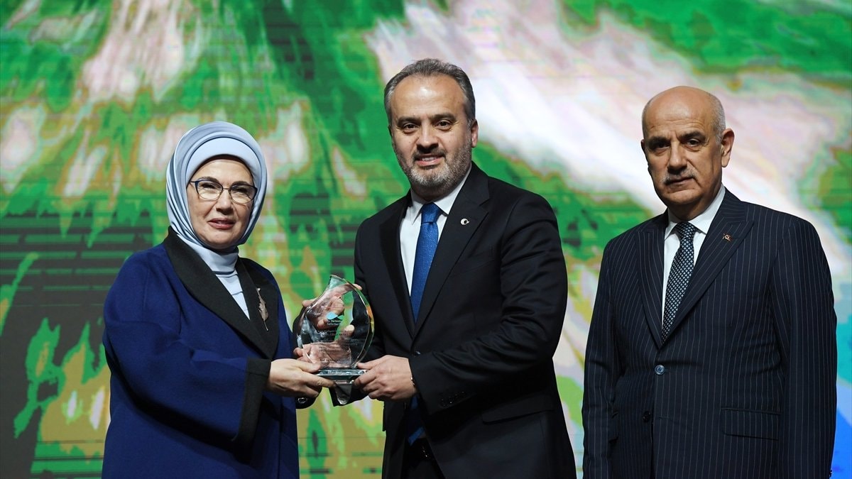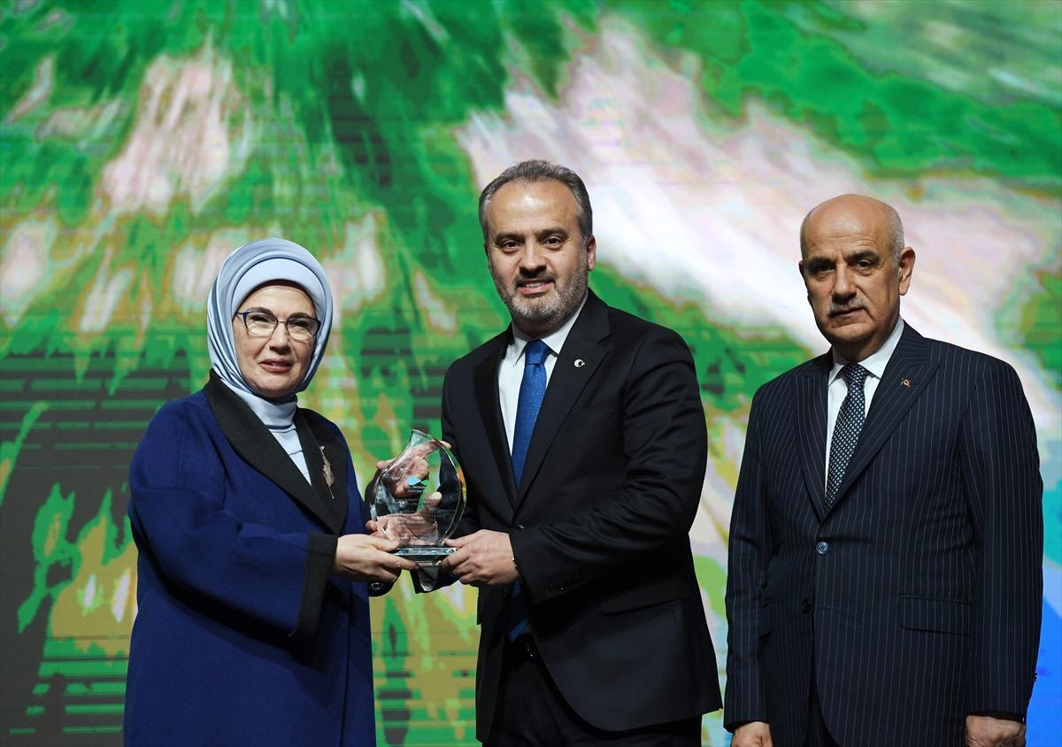Bursa Büyükşehir Belediye Başkanı Alinur Aktaş ödülü, Emine Erdoğan'ın elinden aldı.
