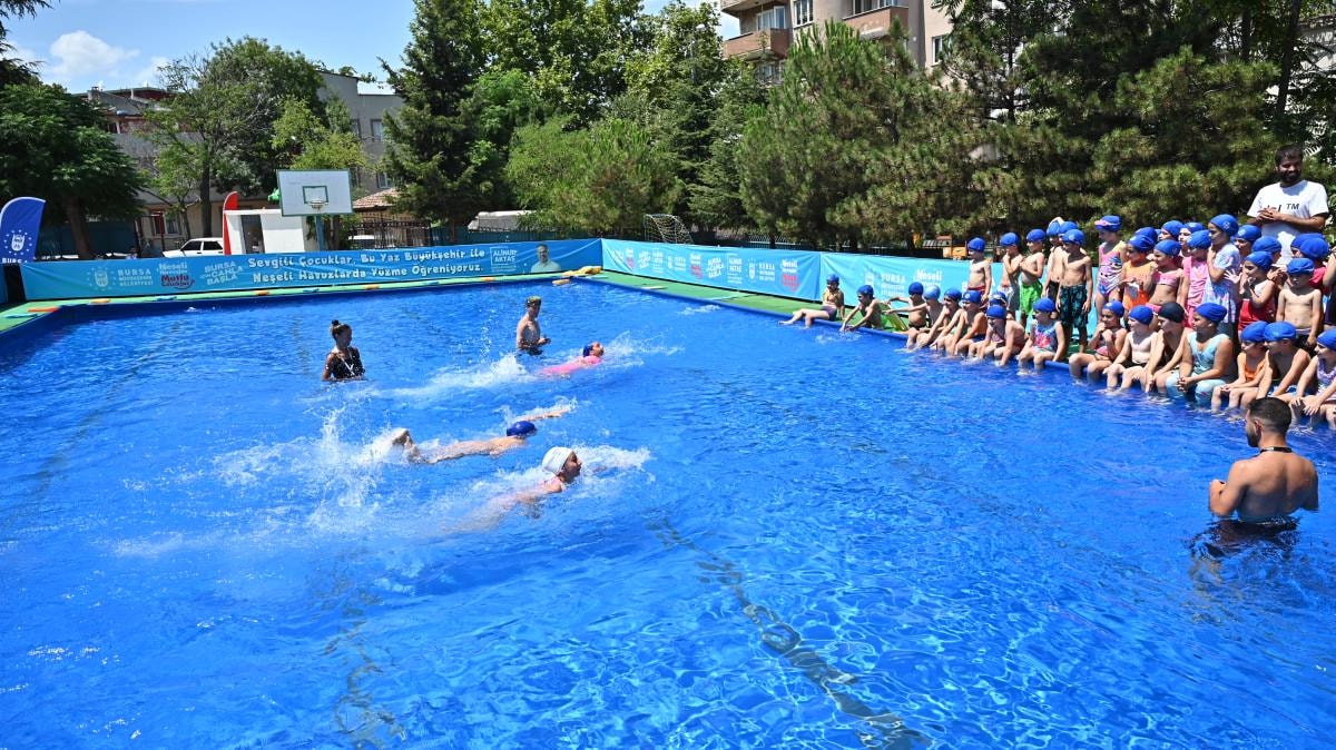 Bursa’nın sporda da marka kent olması, sporun tabana yayılarak 7’den 70’e herkesin sporla buluşması ve özellikle yeni neslin boş zamanlarını sporla iç içe geçirmesi için farklı projeleri hayata getiren Büyükşehir Belediyesi, yaz döneminde de okul bahçelerini havuzlarla renklendirdi.