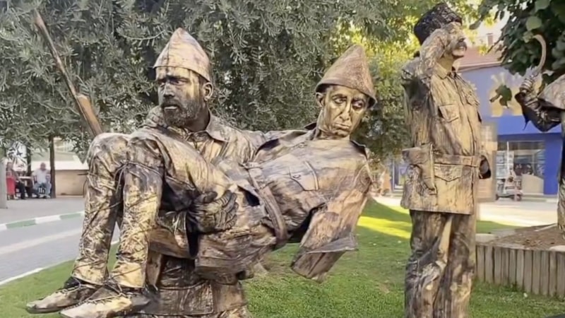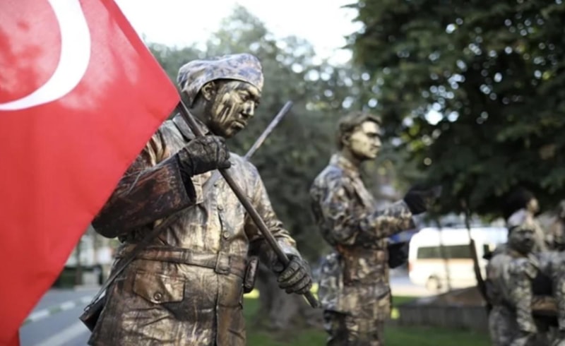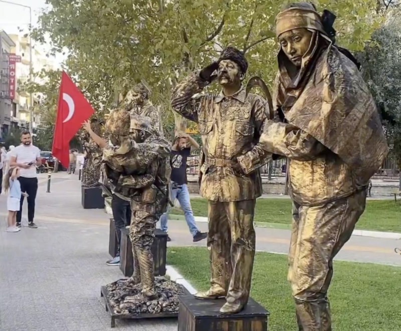 Kurtuluş Savaşı'nda mücadele etmiş sembol karakterlere hayat veren canlı heykeller, Bursa'nın Gemlik ilçesinde kurtuluşun 102'inci yıl dönümü etkinlikleri kapsamında İskele Meydanı'nda sergilendi.