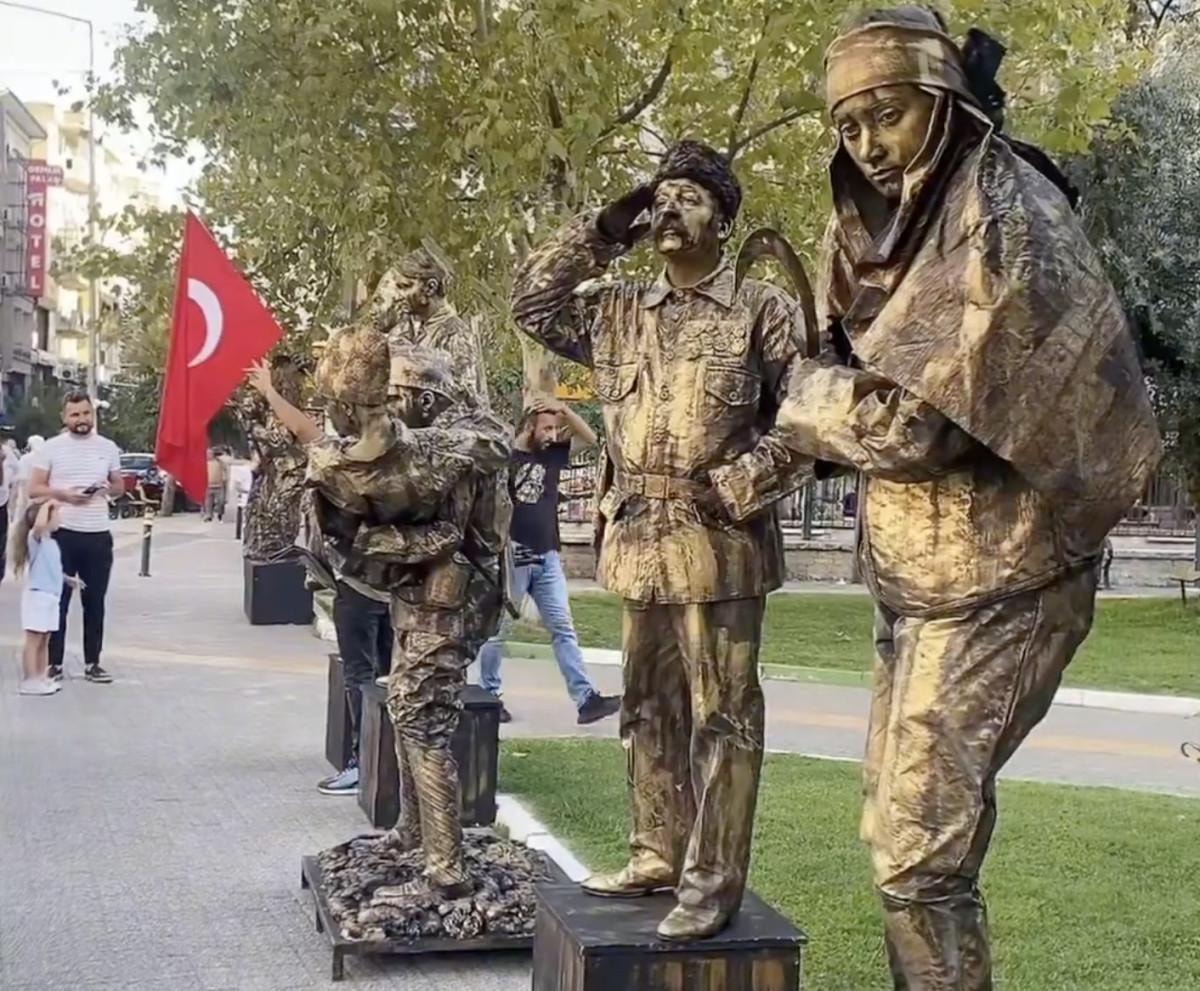 Sanatçılar, saatlerce sabit durarak, zaman zaman pozlarını değiştirerek Milli Mücadele'yi Gemliklilere anlattılar.