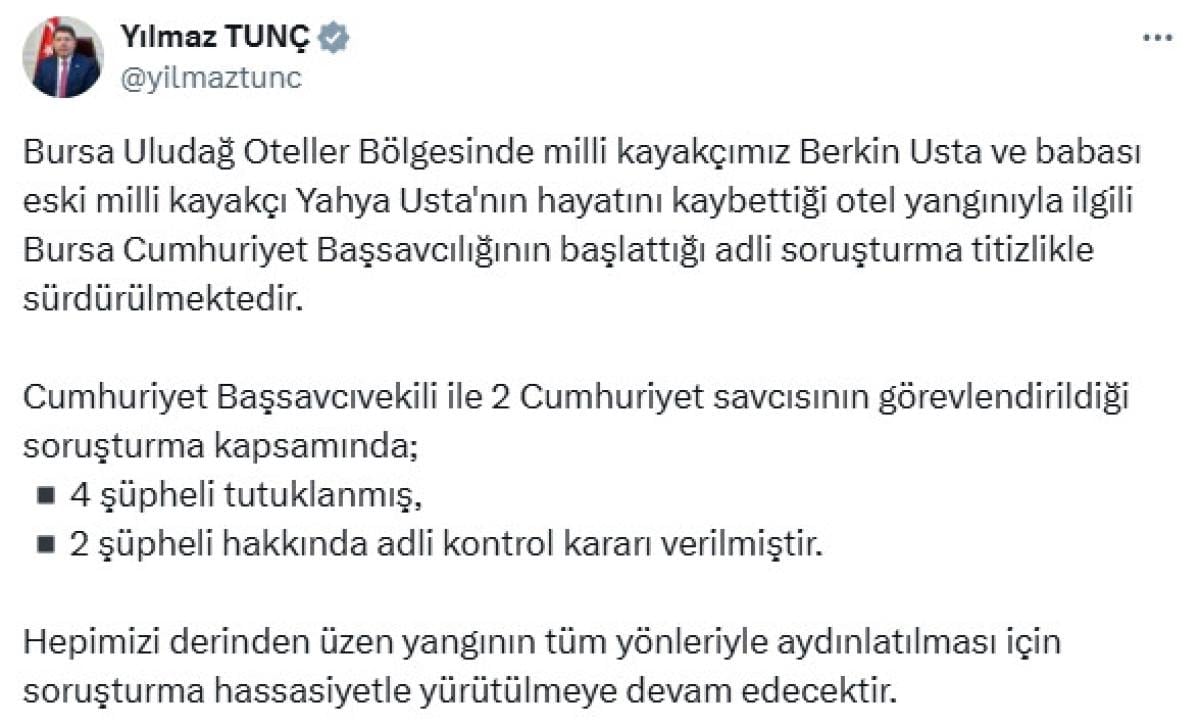 Bursa Uludağ Oteller Bölgesinde milli kayakçımız Berkin Usta ve babası eski milli kayakçı Yahya Usta'nın hayatını kaybettiği otel yangınıyla ilgili Bursa Cumhuriyet Başsavcılığının başlattığı adli soruşturma titizlikle sürdürülmektedir.