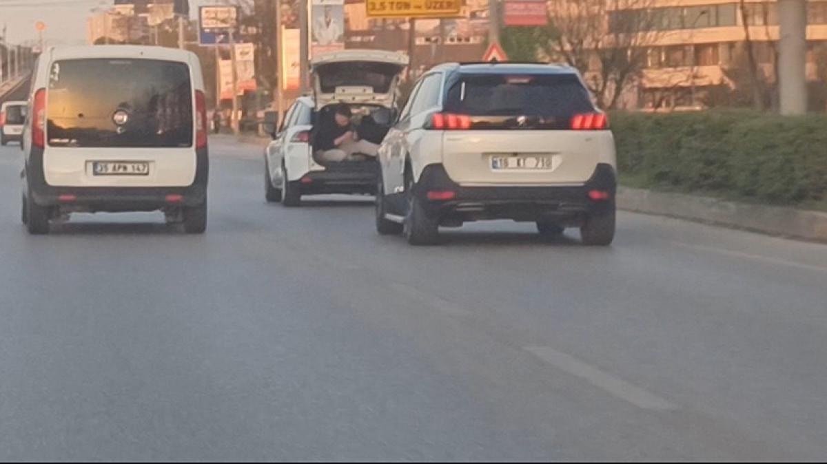 Bursa'nın İzmir Yolu Caddesi'nde gençler otomobil çekimi yapmak için başka bir otomobilin bagajına oturdu.