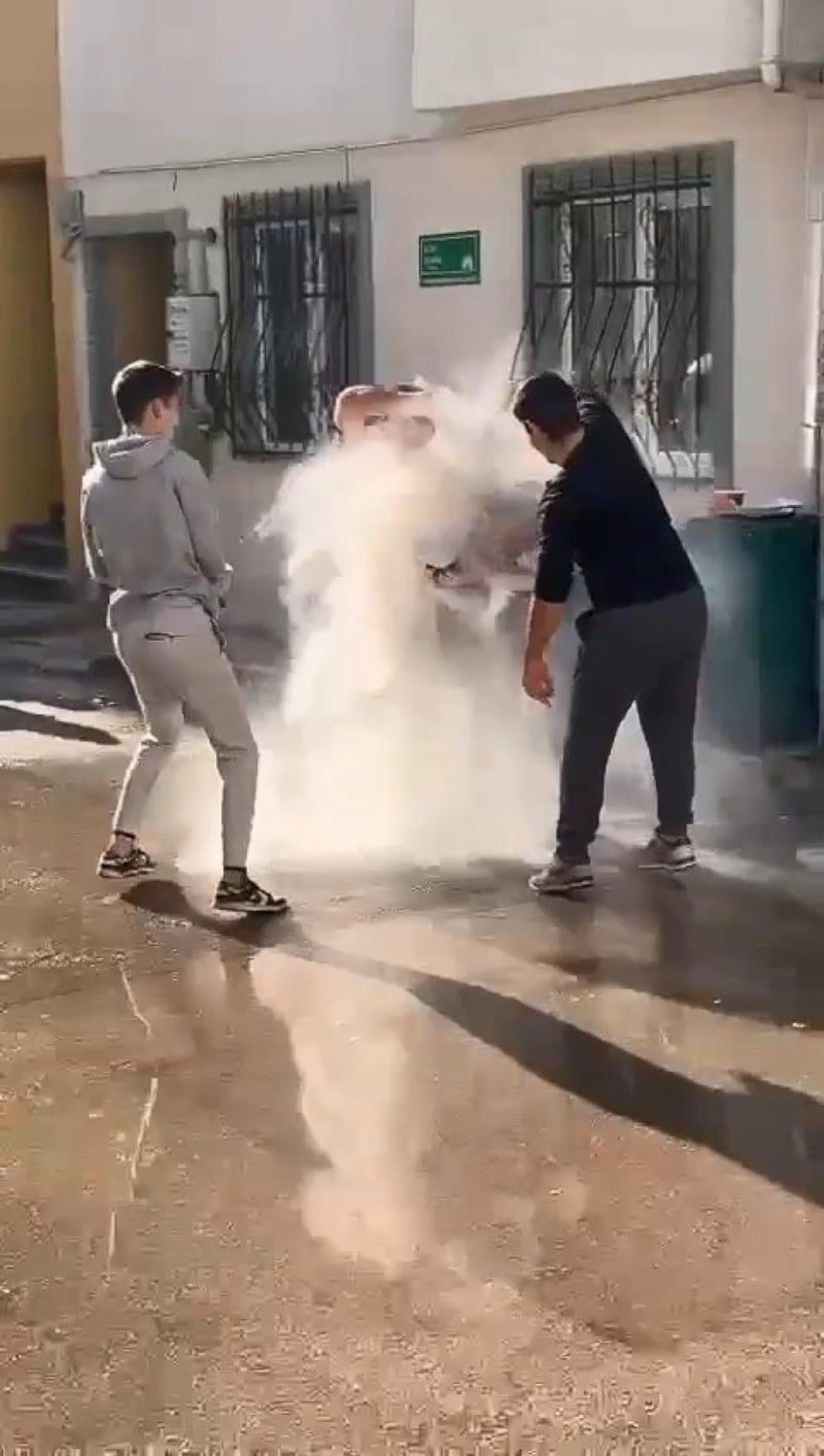 Daha sonra ise yangın tüpüyle sınav devam ederken ilginç gelenek cep telefonu kamerasına yansıdı.