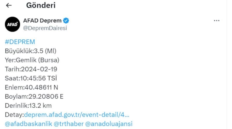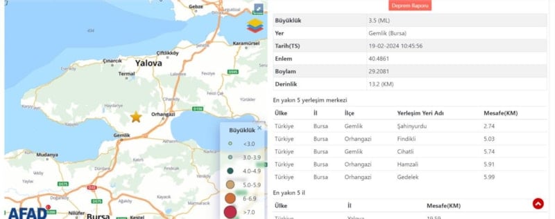 Bursa'da, merkez üssü Gemlik olan bir deprem meydana geldi. AFAD, depremin büyüklüğünü 3.5 olarak açıkladı. İstanbul'da da hissedilen sarsıntı, yerin 13.2 km derinliğinde gerçekleşti.