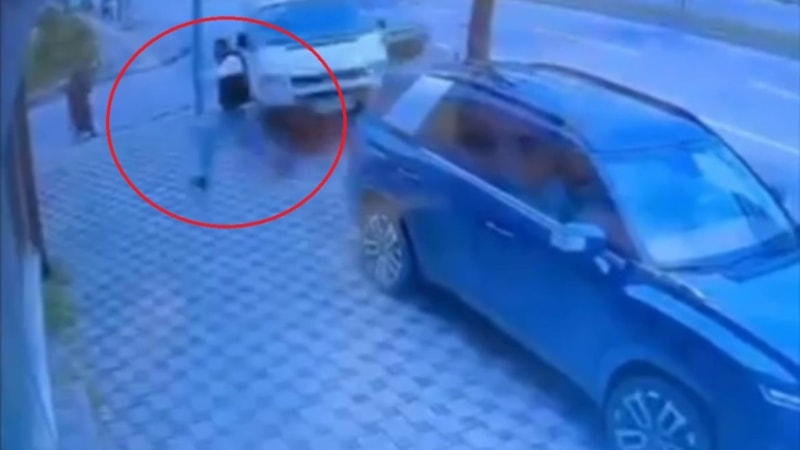 İki araç arasında sıkışmaktan son anda zıplayarak kurtuldu.