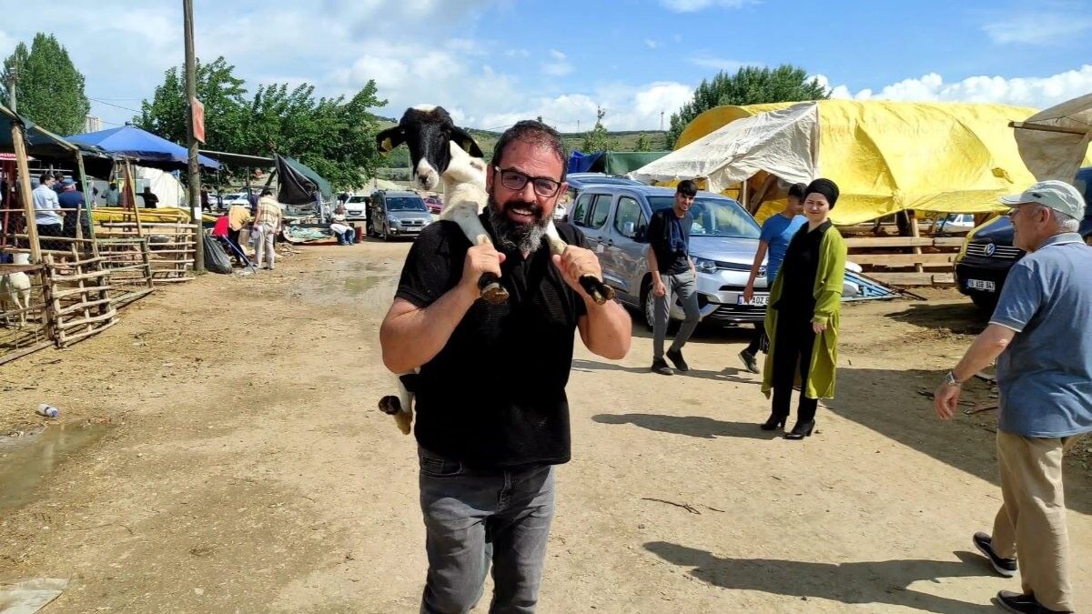 Kurban pazarında kurbanlık için alınan hayvanların zorla götürülmesine şahit olan kişi, aldığı kurbanlıkkoyununu çocuğugibisırtındataşıdı.