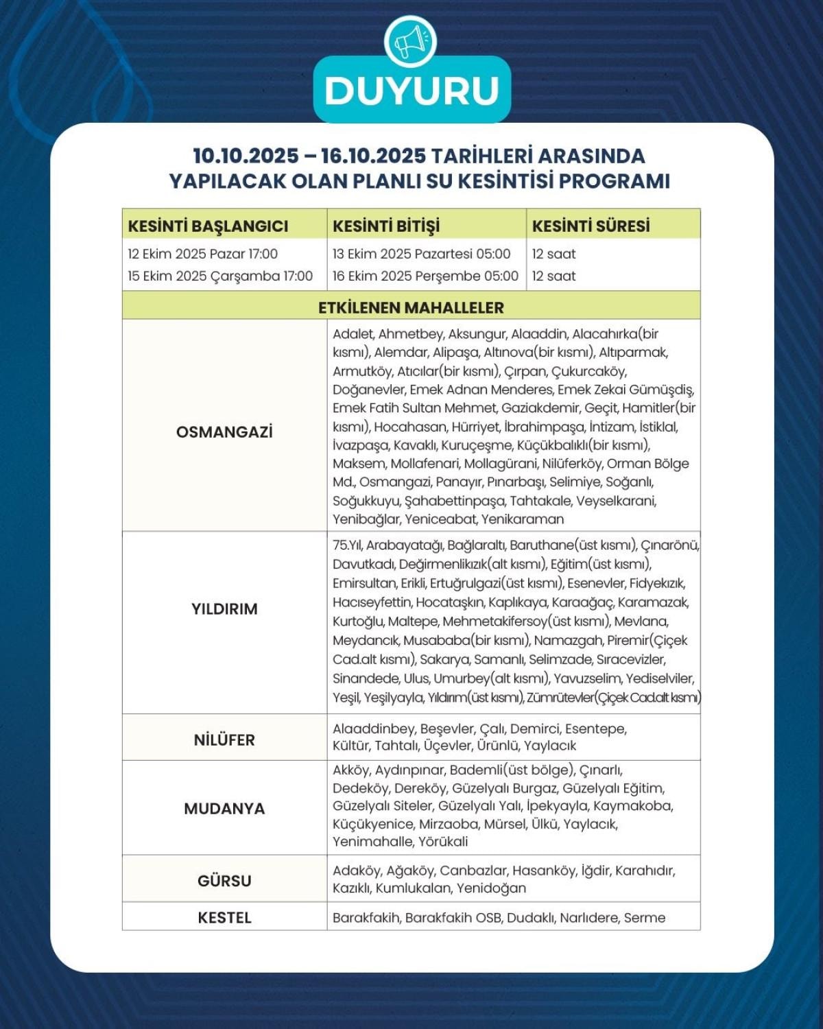 - Planlı su kesintileri günlük 12 saati geçmeyecek ve merkez ilçelerde dönüşümlü uygulanacak.