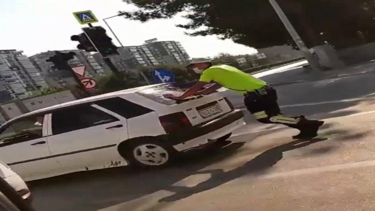 Bozulan otomobil yolda kalıp trafiği sıkıştırınca yardıma trafik polisi geldi. Kavşakta duran otomobili iterek sürücüye yardım eden polis memuru, trafiği açtı.